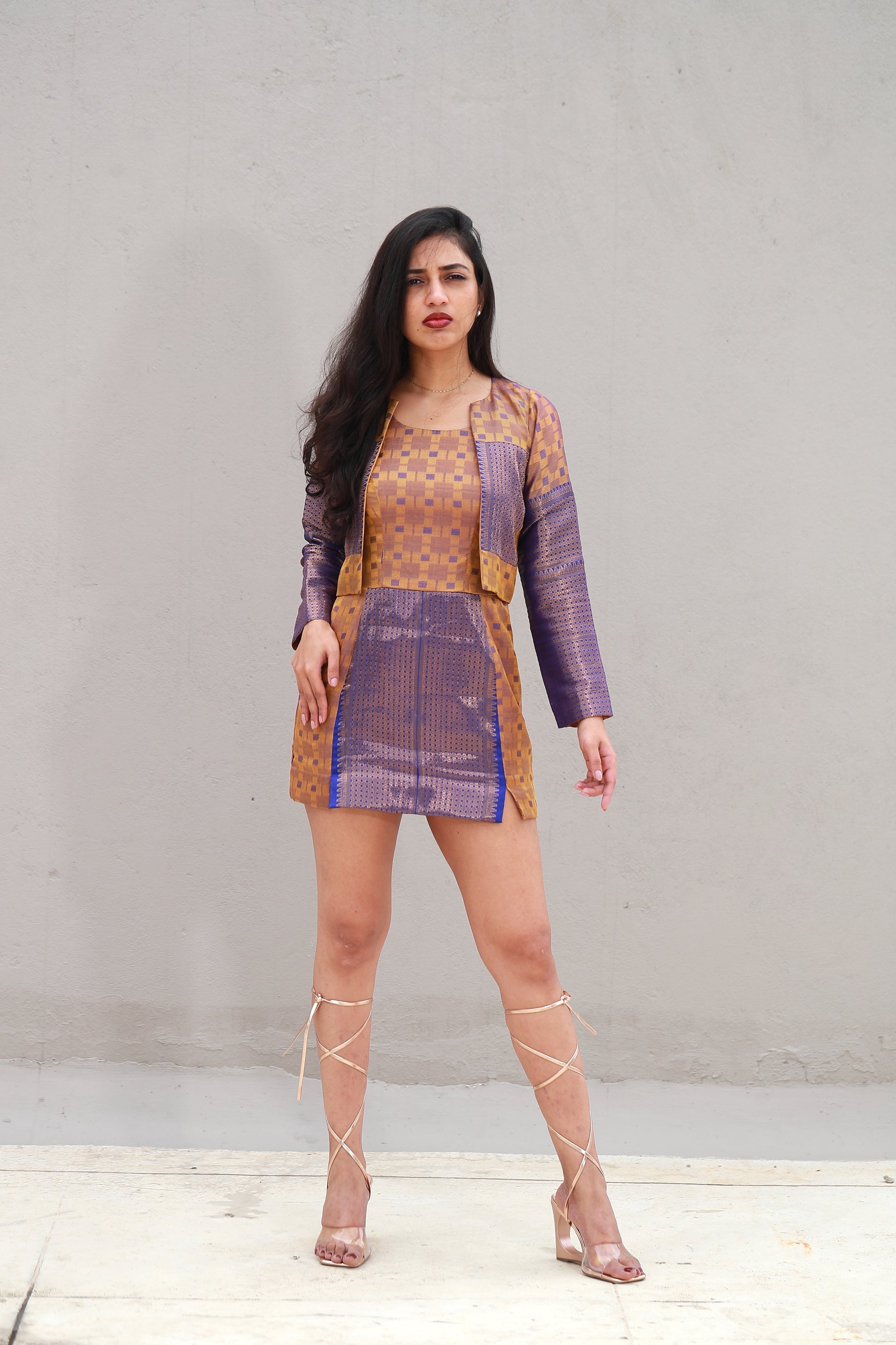 Handcrafted from an up-cycled saree, this cropped blazer features intricate Zari embroidery, adding a touch of opulence to any outfit. With its cropped silhouette and full sleeves, it is a perfect blend of style and sustainability. Elevate your everyday casuals with this exclusive piece.