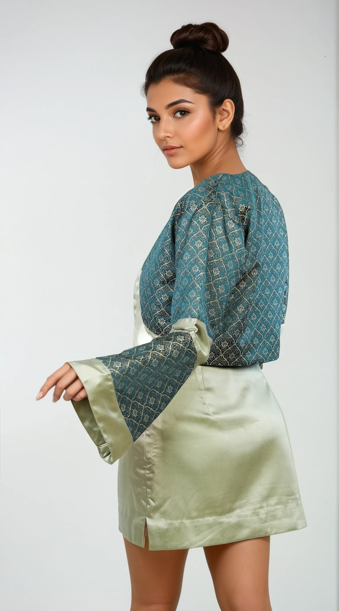 Designed for the modern fashion enthusiast, its flared sleeves and tailored fit make it a perfect blend of traditional elegance and contemporary style. Ideal for festive occasions, weddings, or statement evening wear, this jacket is a versatile piece for those who love to stand out.