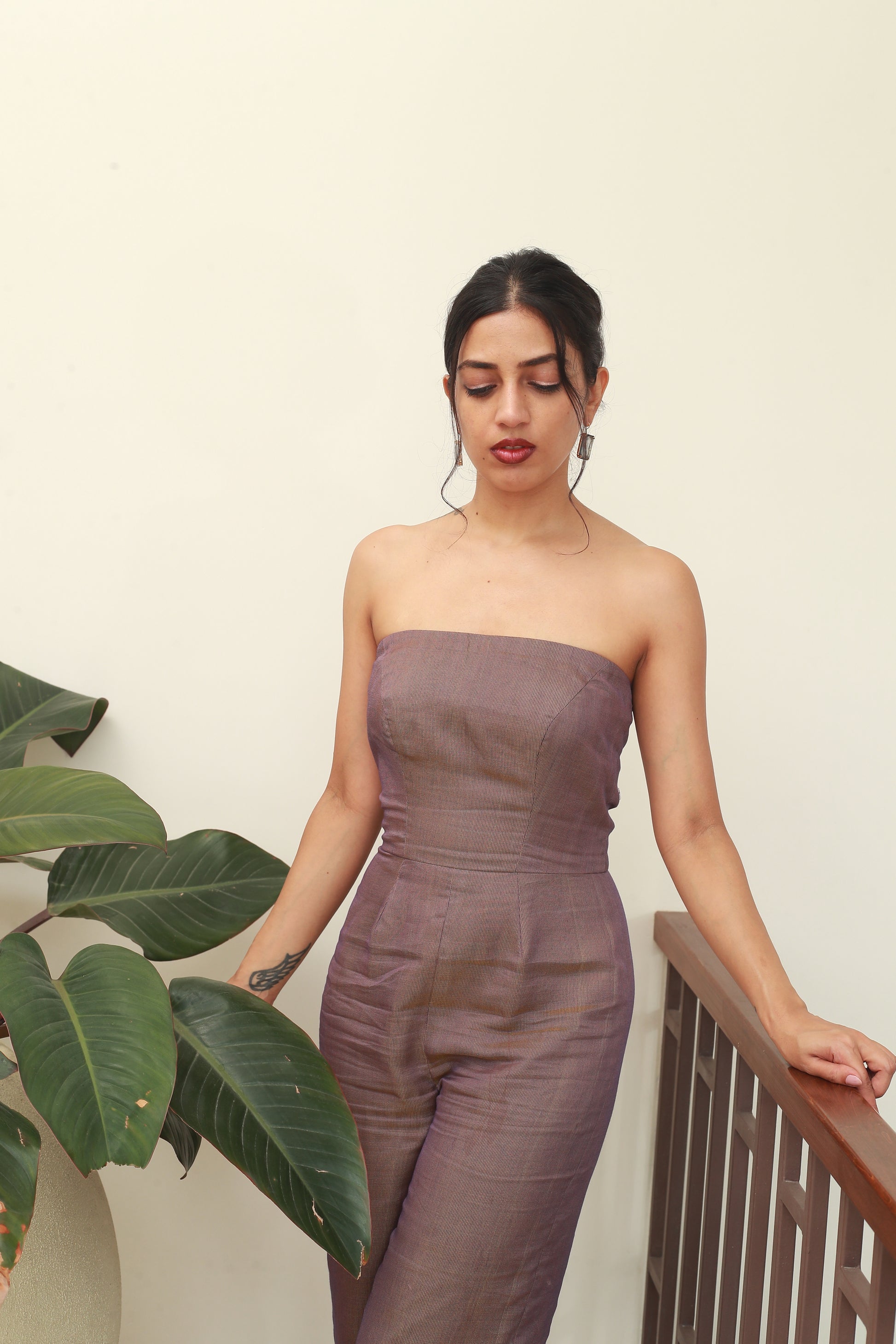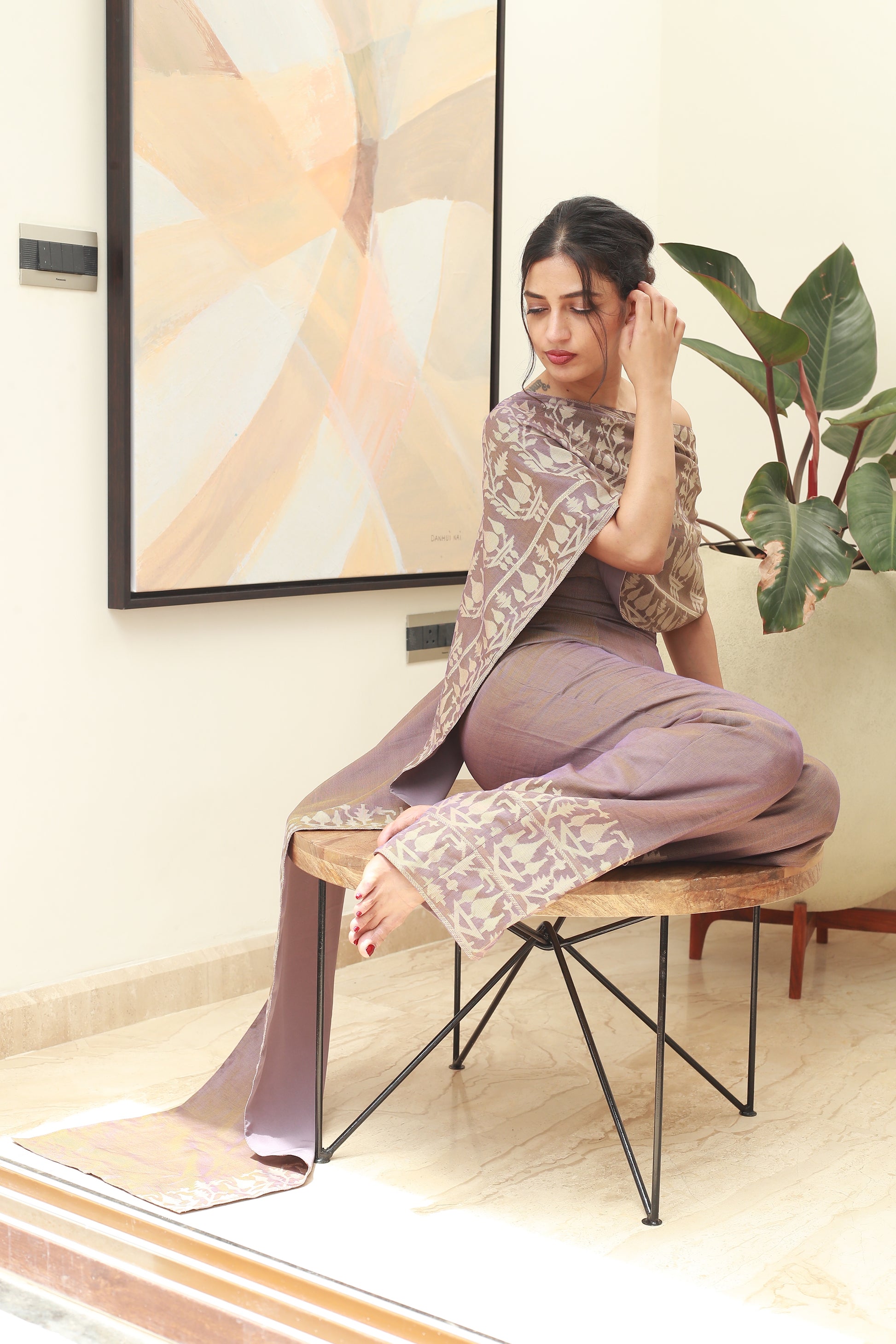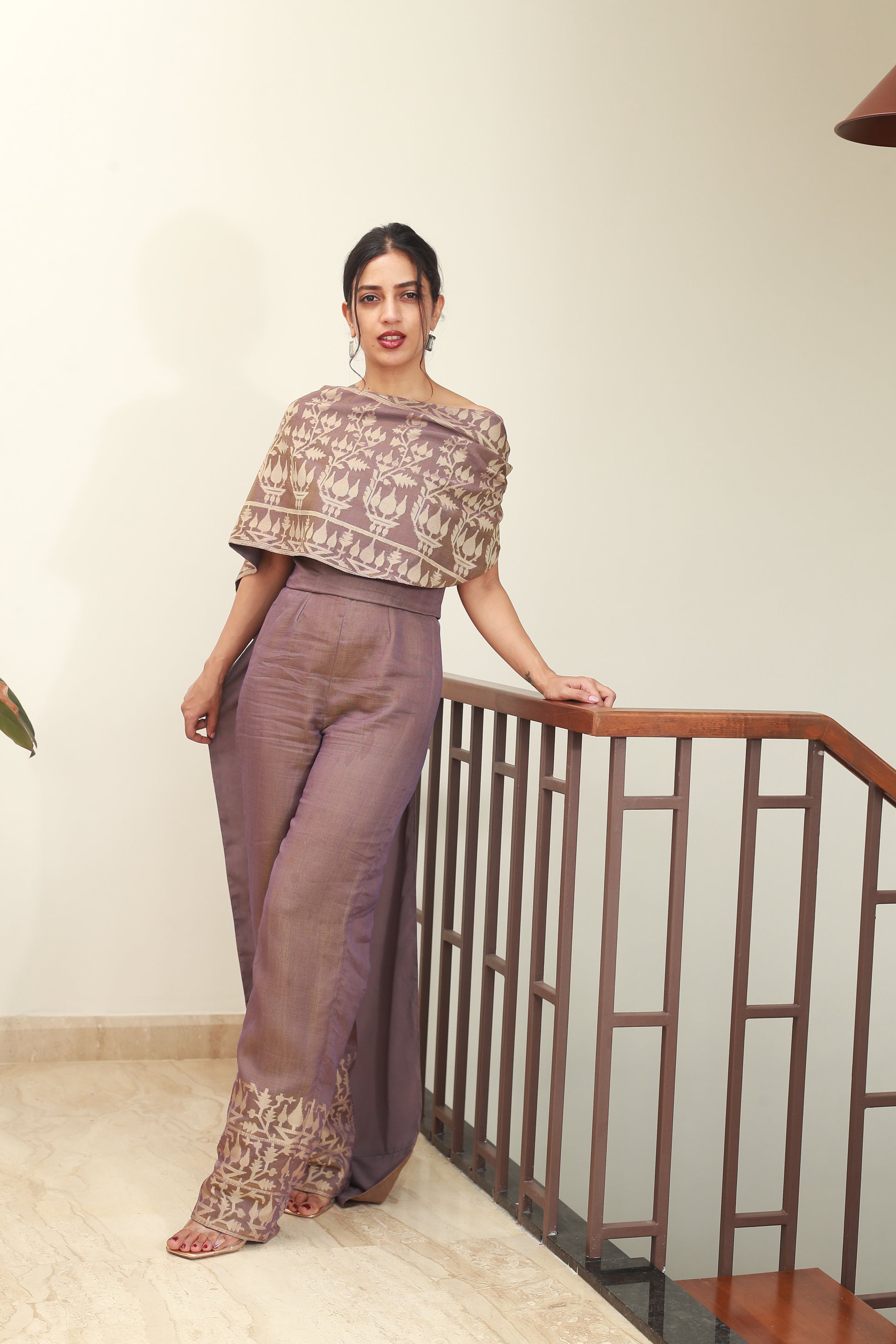 Embrace your inner goddess with this effortlessly elegant jumpsuit and embroidered cape. Crafted from an upcycled saree, this look features delicate pattern work woven onto dual-toned thread. Embrace statement sustainability in this one-of-a-kind piece that is sure to garner attention.