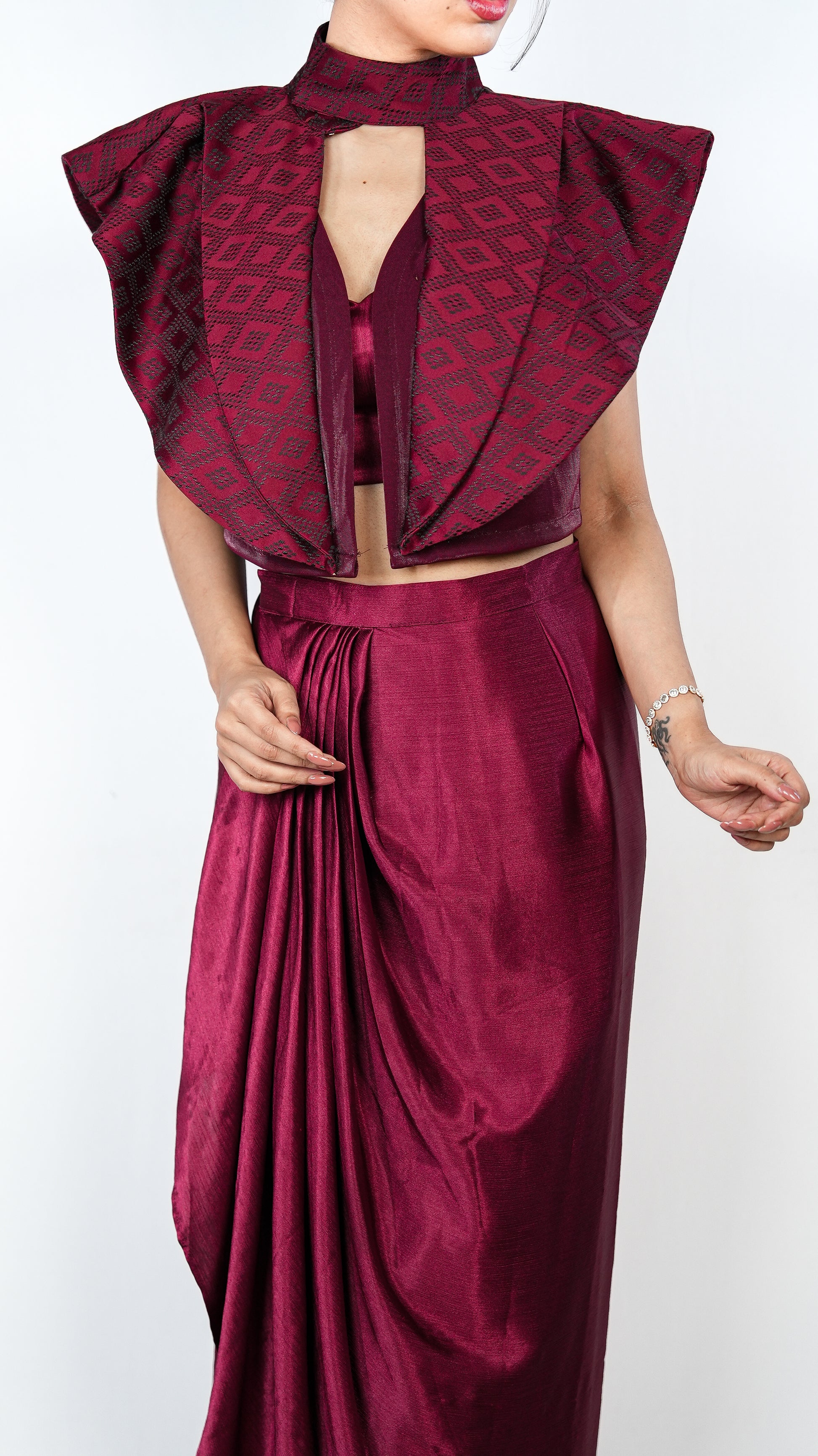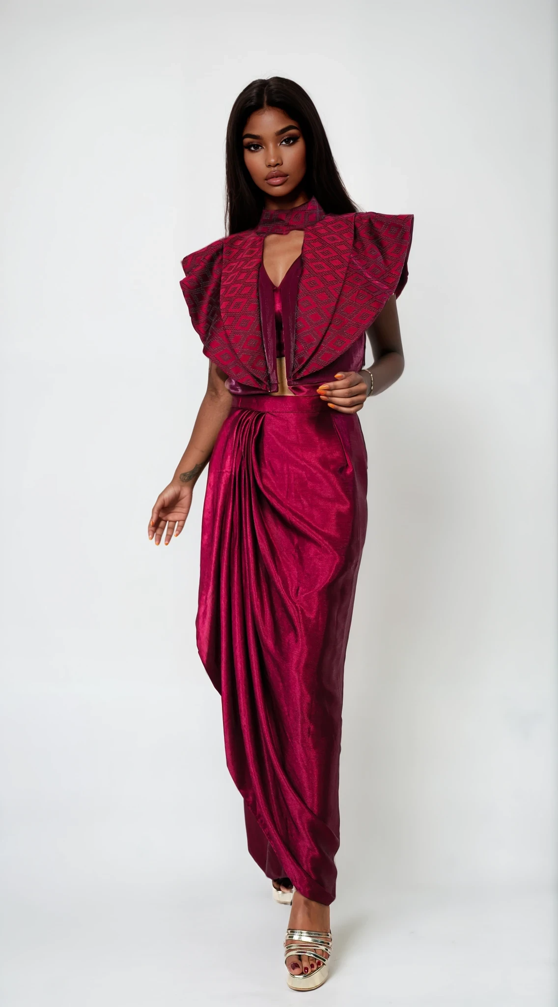 The statement choker design is truly one-of-a-kind and sure to turn heads in every room. The structured shoulders add to the drama and this jacket is sure to be the focus of every look.