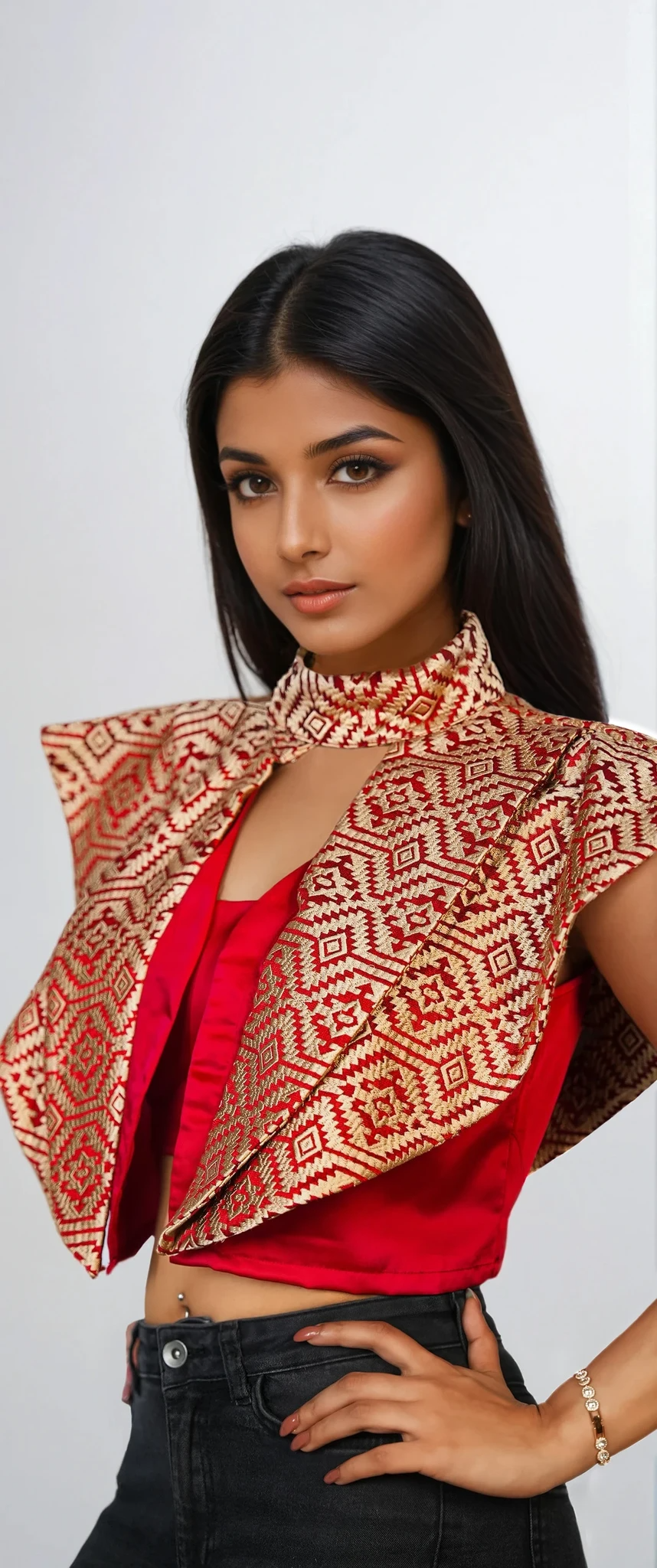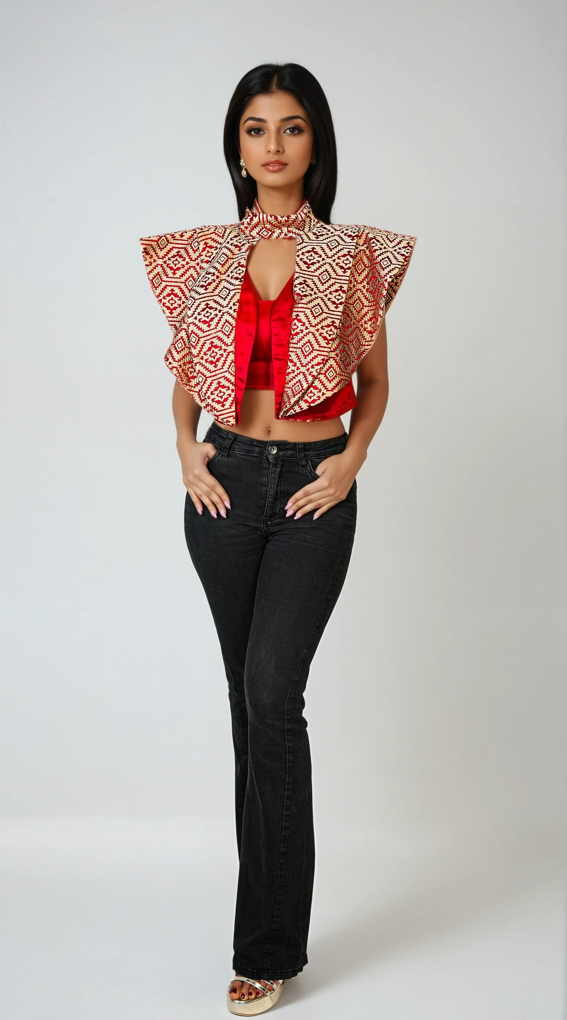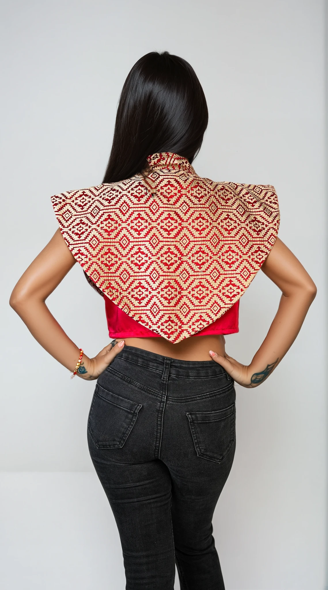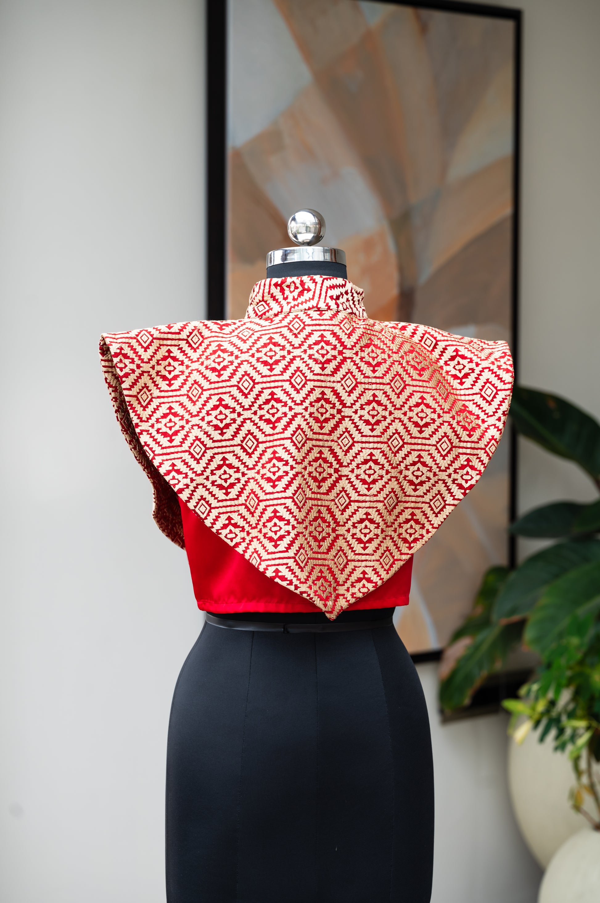 The statement choker design is truly one-of-a-kind and sure to turn heads in every room. The structured shoulders add to the drama and this jacket is sure to be the focus of every look.