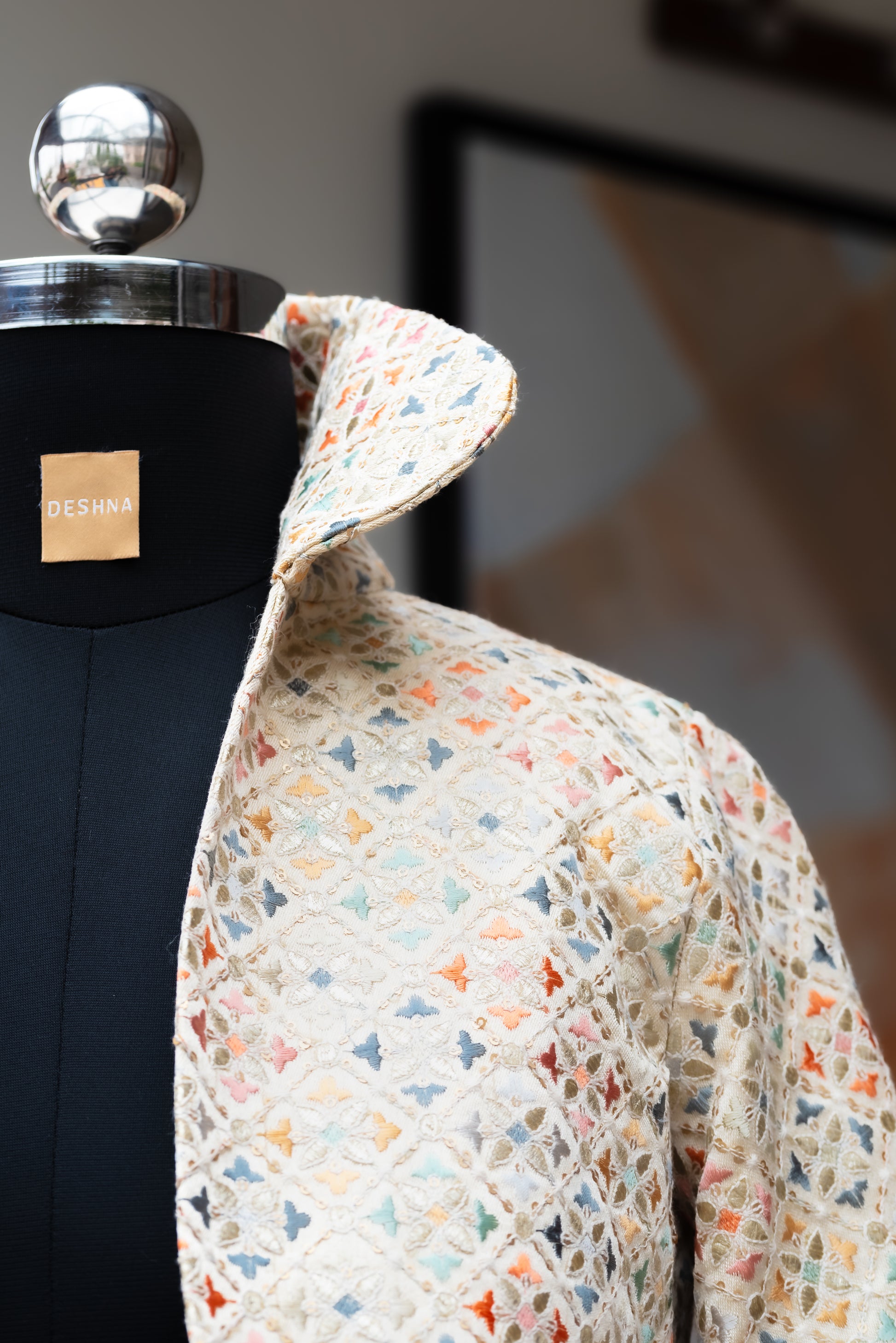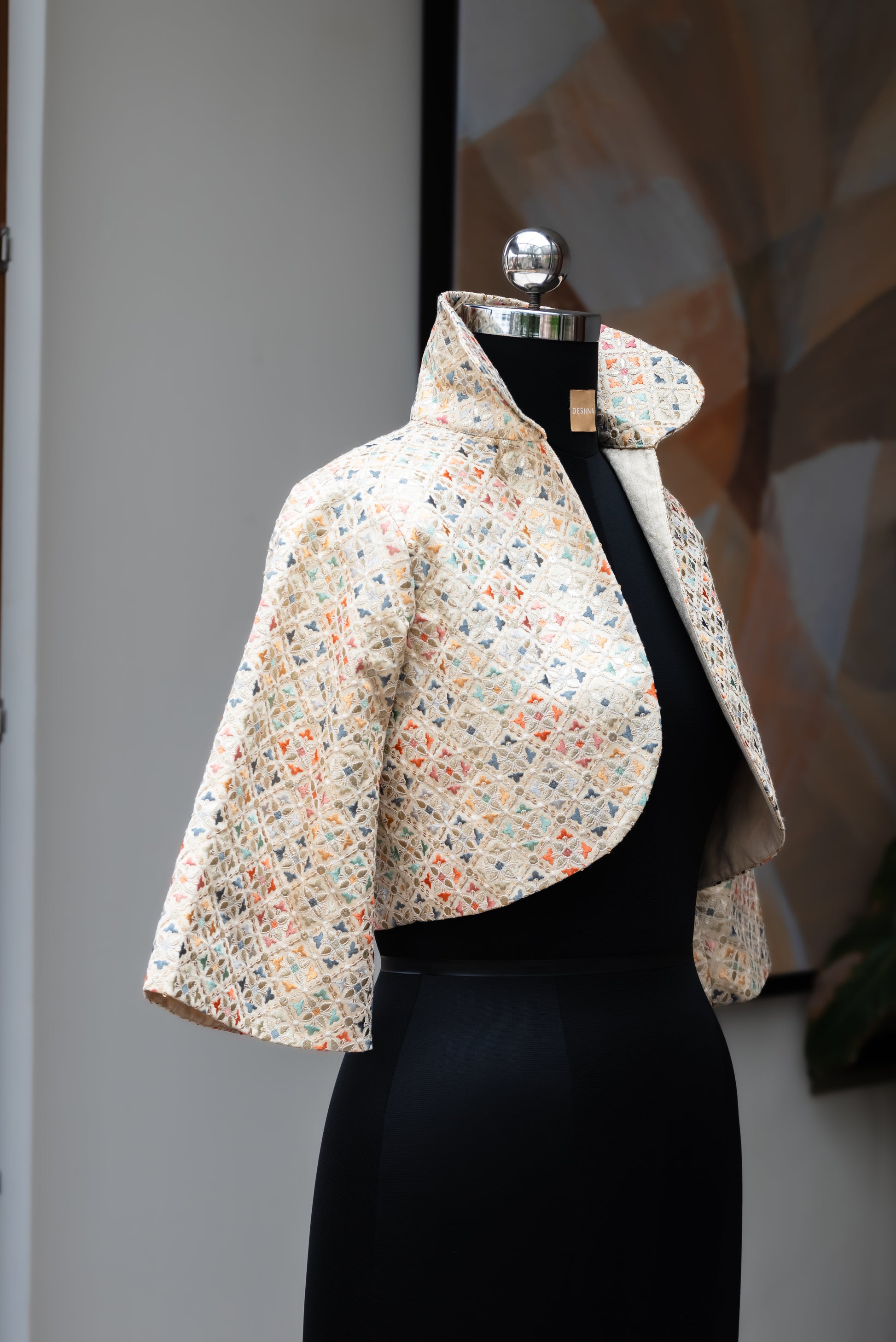 Structured and embroidered, this cream cropped jacket is so easy to wear. Add a flair of opulence and elegance to casual looks or pair it with traditional garments like a draped saree or kurta set.
