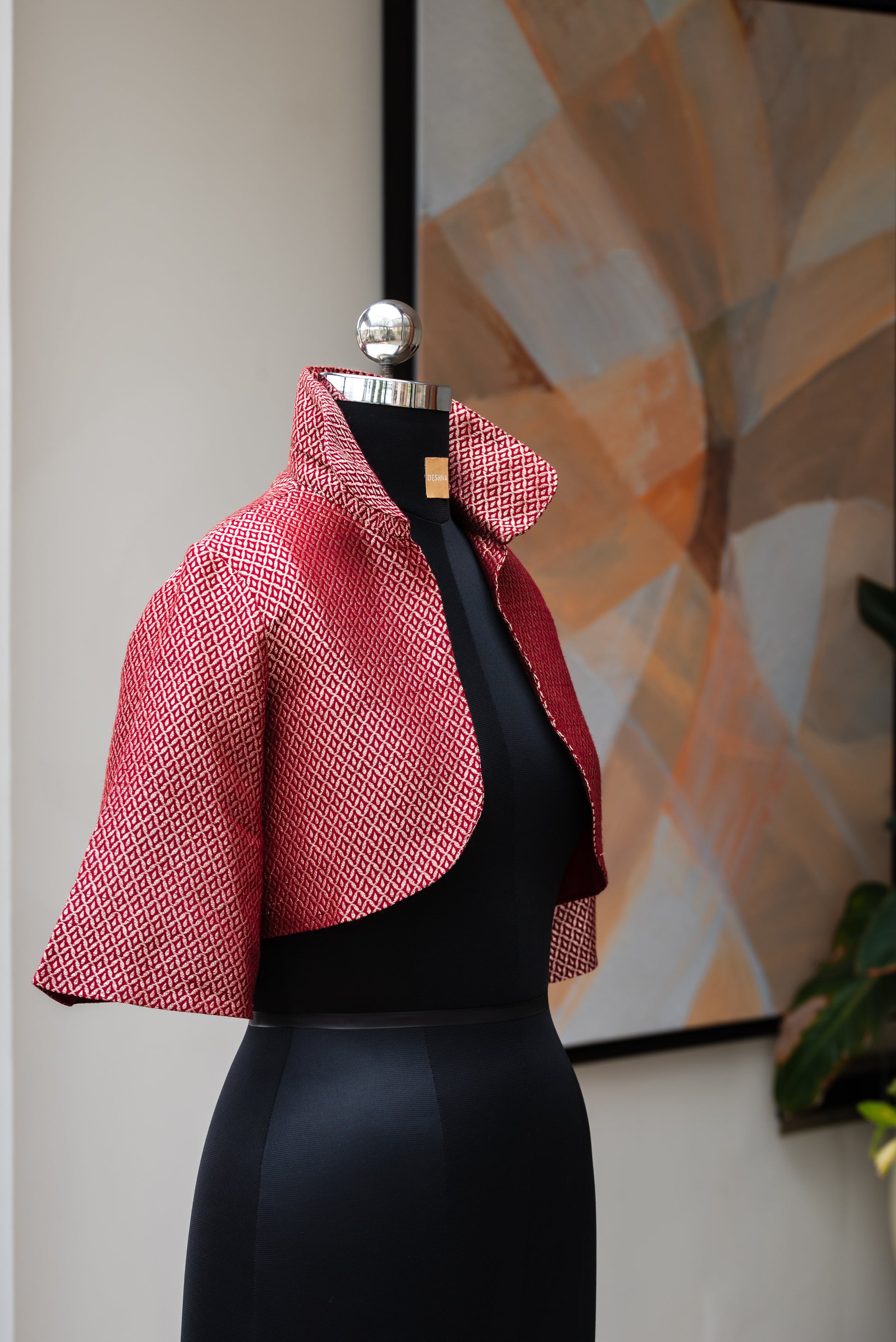 This lightweight cropped jacket with flared sleeves is so easy to pair with all your evening wear. The pattern and zari threadwork make it a great festive addition!